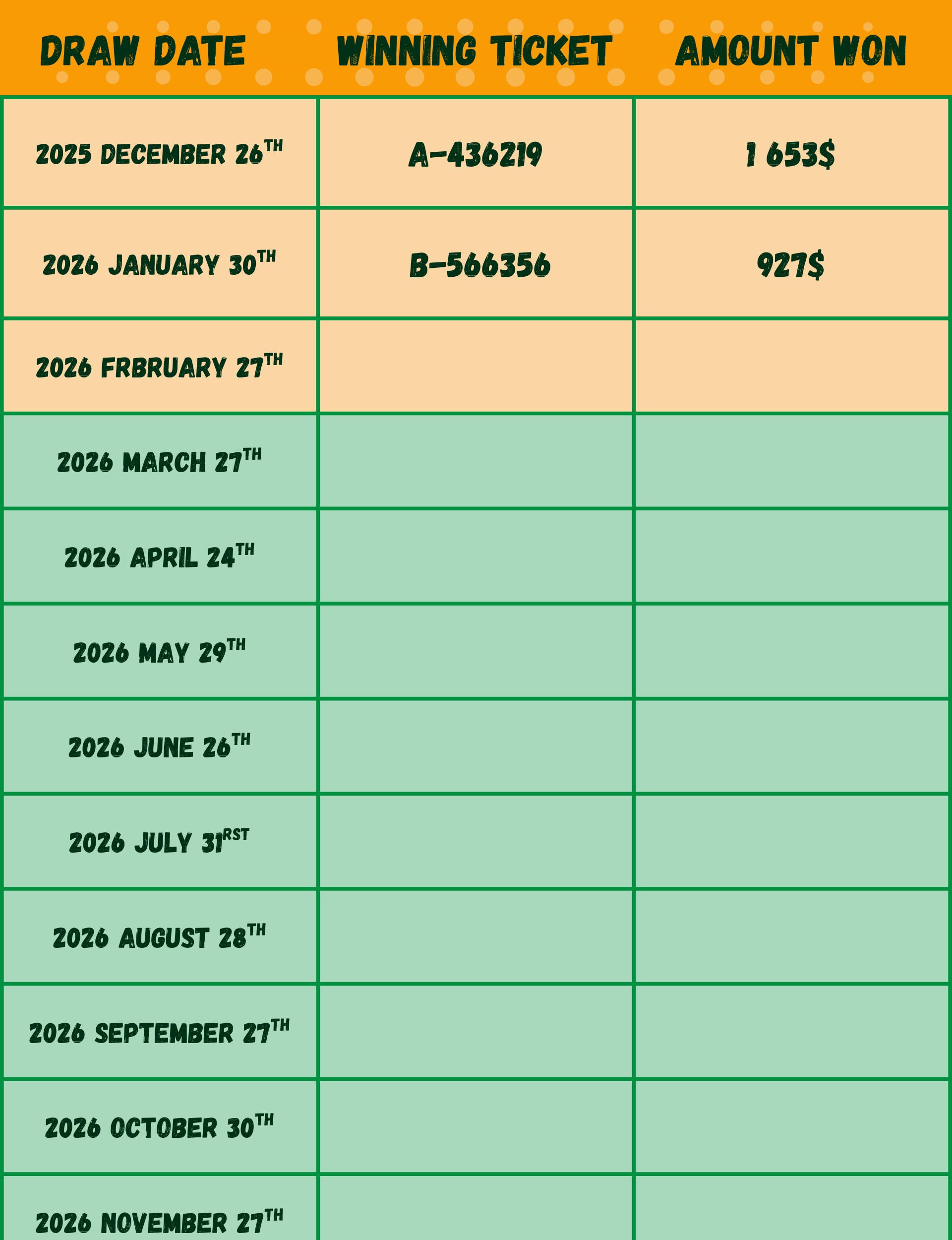– No official tax receipt will be issued for raffle ticket purchases, as per the Canada Revenue Agency.