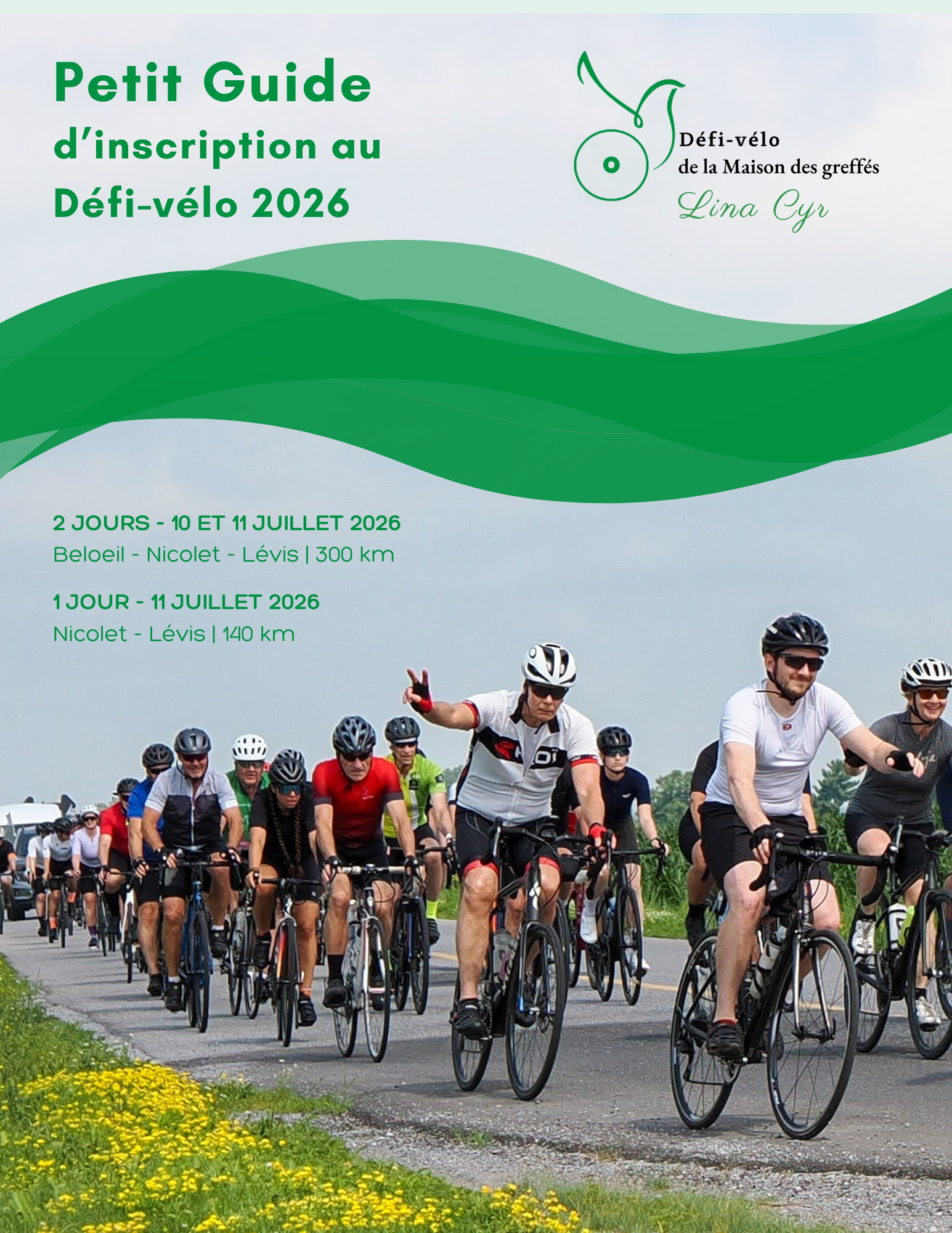 The Bike Challenge is the flagship annual event of the Maison des greffés Lina Cyr. By participating, you directly help fund affordable, safe, and high-quality accommodation services offered to transplant recipients—whether they are undergoing evaluation, waiting for a transplant, or recovering—as well as to their loved ones.