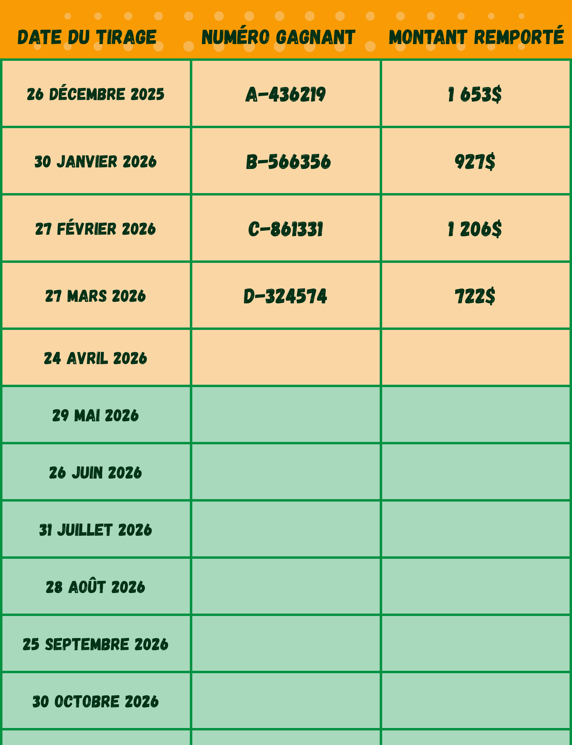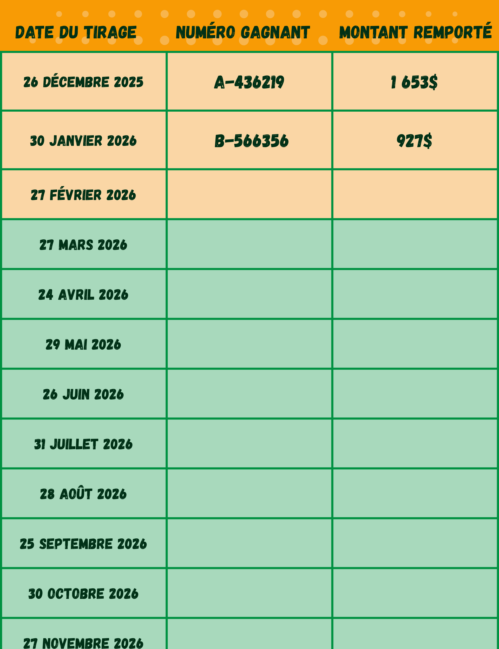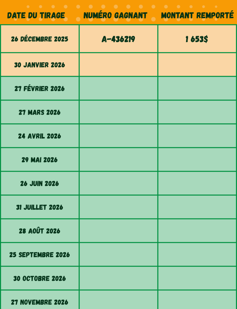 –Les dates prévues du tirage sont : 26 décembre 2025; 30 janvier 2026; 27 février 2026; 27 mars 2026; 24 avril 2026; 29 mai 2026; 26 juin 2026; 31 juillet 2026; 28 août 2026; 25 septembre 2026; 30 octobre 2026; 27 novembre 2026.